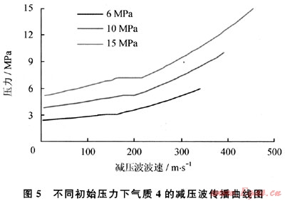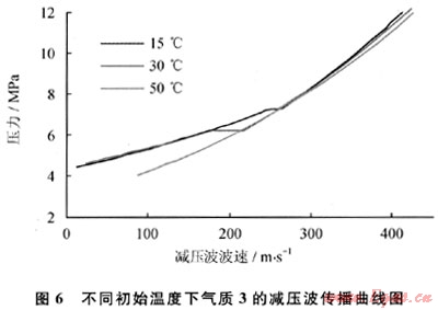 為了研究初始?jí)毫?duì)減壓波特性的影響,以表2中氣質(zhì)4為例,保持初始溫度30℃不變,采用Decomwave軟件對(duì)不同初始?jí)毫?6MPa、10MPa、15MPa)的減壓波波速進(jìn)行計(jì)算,結(jié)果如圖5所示。