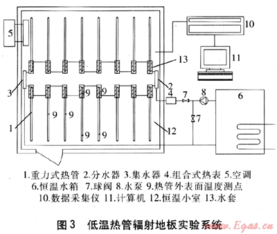 碳鋼/水重力式熱管(又稱碳鋼/水兩相閉式熱虹吸管)具有結(jié)構(gòu)簡單、成本低廉、傳熱性能優(yōu)良、工作可靠等特點,在冶金、化工、建材、動力等行業(yè)有很多成功的應(yīng)用實例[1]。隨著熱管技術(shù)的不斷成熟,其在建筑行業(yè)的應(yīng)用引起了學(xué)者們的關(guān)注。JEBRAIL等制作了熱管散熱器并測試了其熱工性能[2],國內(nèi)學(xué)者蔣愛華等對熱管輻射墻壁進(jìn)行了探討[3],羅清海等分析了不同工質(zhì)熱管散熱器的熱工性能[4]。本文擬將碳鋼/水重力式熱管與地板輻射采暖系統(tǒng)結(jié)合起來,以期利用其優(yōu)良的傳熱性能,在提供舒適熱環(huán)境的同時,達(dá)到降低供水溫度、減小熱水循環(huán)流量、提高系統(tǒng)整體運行效率和經(jīng)濟性的目的。本文在重力式熱管和串聯(lián)熱管傳熱性能研究的基礎(chǔ)上[5],對低溫?zé)峁茌椛涞匕宓臒峁ば阅苓M(jìn)行實驗研究。