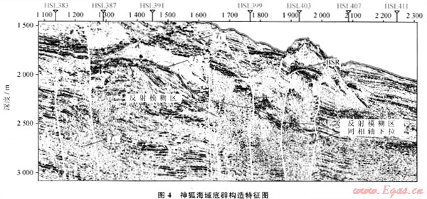 底辟構(gòu)造和天然氣水合物的形成與運(yùn)移聚集也有密切的關(guān)系,底辟構(gòu)造由地球深部物質(zhì)上拱或刺穿到淺部產(chǎn)生,在形成過(guò)程中會(huì)引起構(gòu)造側(cè)翼和頂部沉積層的傾斜和破裂,促使流體的排放,因而對(duì)水合物的形成十分有利。大量的調(diào)查資料顯示[14~15]:珠江口盆地白云凹陷中心有大量底辟群的存在,在神狐海域前期調(diào)查中,識(shí)別出了5個(gè)泥底辟異常反射體,其中4個(gè)位于白云凹陷內(nèi)。這些識(shí)別出來(lái)的底辟構(gòu)造在高分辨率地震剖面上表現(xiàn)特征主要為地震反射模糊區(qū)(帶),橫向上反射同相軸的連續(xù)性變差或錯(cuò)斷,內(nèi)部反射較雜亂,甚至為空白反射,局部見(jiàn)同相軸下拉現(xiàn)象;其兩側(cè)、頂部常見(jiàn)亮點(diǎn)振幅異常,白云凹陷北坡鉆井已揭示這種亮點(diǎn)與氣層存在良好對(duì)應(yīng)關(guān)系。因此,推斷這種反射模糊區(qū)應(yīng)為流體作用的結(jié)果(圖4)[16]。底辟構(gòu)造的存在說(shuō)明凹陷中心曾經(jīng)孕育著高壓、超壓系統(tǒng)。由于現(xiàn)今地層具有正常壓力,這說(shuō)明超壓的累積和釋放與深部烴源巖生烴及排烴有一定的關(guān)系。與底辟構(gòu)造密切伴生的大量亮點(diǎn)指示著沿底辟構(gòu)造的天然氣垂向輸導(dǎo),構(gòu)成了古近系油氣運(yùn)移到新近系 第四紀(jì)的成藏動(dòng)力系統(tǒng)。底辟構(gòu)造的發(fā)育在不同深度形成了上覆拱張,上覆地層產(chǎn)生了高角度的斷裂和垂向裂隙系統(tǒng),構(gòu)成流體運(yùn)移的另一個(gè)通道。