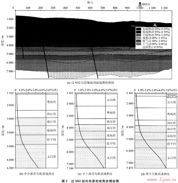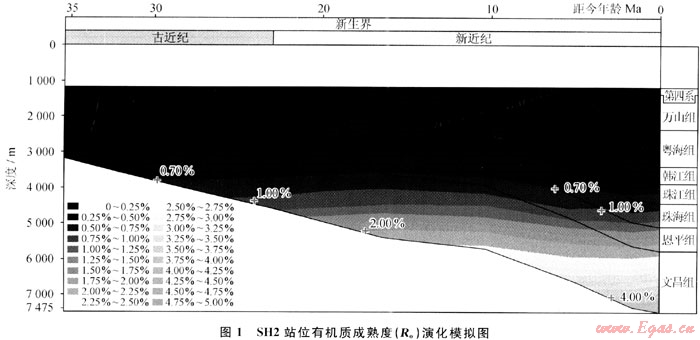 2007年4~6月,廣州海洋地質(zhì)調(diào)查局在神狐海域研究區(qū)內(nèi)實(shí)施了天然氣水合物鉆探,先后在3個(gè)站位成功鉆獲了天然氣水合物實(shí)物樣品,對(duì)其中的SH2站位沉積物樣品中的氣體進(jìn)行的氣相色譜分析的結(jié)果顯示[10]:CH4的體積分?jǐn)?shù)占96%~99%,C2H6和C3H8的體積分?jǐn)?shù)很低,干燥系數(shù)(C1/C2)一般在數(shù)百至1000以上,為典型的干氣。SH2站位含水合物層的總有機(jī)碳含量平均值為0.43%,已達(dá)到了作為生物氣烴源巖的標(biāo)準(zhǔn),對(duì)SH2站位進(jìn)行有機(jī)質(zhì)成熟度的熱演化模擬(圖1),結(jié)果表明:淺部地層珠江組、韓江組、粵海組和萬(wàn)山組Ro值低于0.7%,多在0.2%~0.6%,處于未熟-低成熟的生烴門(mén)限附近,屬于良好的生物氣的烴源巖。這幾套層序厚度大,泥巖含量高,熱成熟低,有機(jī)質(zhì)豐度較高[11],其中,上中新統(tǒng)-第四系海相泥巖有機(jī)碳含量平均為0.22%~0.49%,且不同層位及層段均變化不大,第四系有機(jī)碳含量平均為0.22%~0.28%,上新統(tǒng)有機(jī)碳含量平均為0.30%~0.39%,上中新統(tǒng)有機(jī)碳含量平均為0.49%;上中新統(tǒng)-全新統(tǒng)海相泥巖生烴潛力(S1+S2)平均為0.13~0.32mg/g,與鶯歌海盆地大體一致。由此推測(cè),該區(qū)具備生成生物氣的巨大潛力。