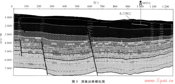 由于受區(qū)域構(gòu)造運(yùn)動(dòng),特別是新構(gòu)造運(yùn)動(dòng)的作用,神狐研究區(qū)內(nèi)斷裂構(gòu)造發(fā)育。斷層可分為北東、北西和北北西向3組,且均為正斷層,其中北東向斷層有明顯切割北西向斷層的趨勢(shì)。斷層活動(dòng)時(shí)間大致可分為晚中新世和上新世以來(lái)2個(gè)主要時(shí)期,晚中新世斷層以北西向?yàn)橹鳎饕植加谘芯繀^(qū)中北部,斷層大部分切割上中新統(tǒng),部分切穿上新統(tǒng),是研究區(qū)最主要斷層活動(dòng)時(shí)期;上新世以來(lái)活動(dòng)斷層以北東向?yàn)橹?,斷層活?dòng)強(qiáng)度小,但數(shù)量眾多。由于這些斷層貫通了下部氣源巖系與上部水合物形成的溫壓穩(wěn)定帶層系,改善了天然氣的垂向運(yùn)移條件,而斷層活動(dòng)時(shí)間又橫跨生氣和排氣高峰期,成為構(gòu)成流體運(yùn)移的一個(gè)主要通道。同時(shí),應(yīng)該注意到如果斷層過(guò)大,直通海底,會(huì)造成部分氣體的散失。從過(guò)SH2站位地震剖面流體運(yùn)移模擬結(jié)果來(lái)看(圖3),由于該處發(fā)育斷裂,直通海底,導(dǎo)致深部熱解氣源部分通過(guò)斷裂直通海底散失,未能有效運(yùn)移至水合物穩(wěn)定域,所以鉆井處熱解氣源對(duì)水合物貢獻(xiàn)較小。同時(shí)從圖中烴氣運(yùn)移方向分析,該處鉆遇的水合物主要為淺層生物成因氣通過(guò)橫向運(yùn)移至水合物穩(wěn)定域形成。