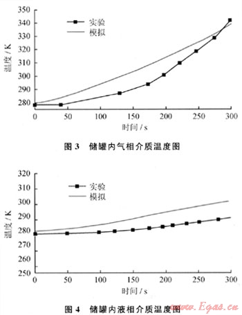圖3、4分別為氣相介質(zhì)和液相介質(zhì)的溫度響應(yīng)過程,計(jì)算值與實(shí)驗(yàn)值吻合較好,最大誤差分別為4.5%和4%。其中,氣相取距離儲(chǔ)罐頂部50mm處的介質(zhì)溫度,液相取距離儲(chǔ)罐底部200mm處介質(zhì)的溫度。由圖3和圖4對(duì)比可知,液相介質(zhì)的溫度升高較氣相介質(zhì)緩慢,300s內(nèi)氣相介質(zhì)和液相介質(zhì)的溫度分別升高了63K和11K。原因在于一方面蒸汽的比熱容遠(yuǎn)小于液相的[2];另一方面液相介質(zhì)過熱后會(huì)通過相變將熱量轉(zhuǎn)化到氣相,使得液相介質(zhì)本身儲(chǔ)存的熱量較少。
