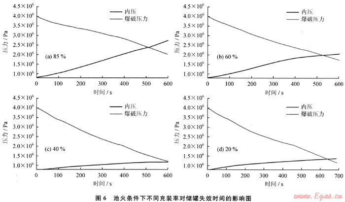 3) 池火作用下,LPG儲(chǔ)罐失效受到兩個(gè)因素控制,一是介質(zhì)溫度升高導(dǎo)致的儲(chǔ)罐內(nèi)介質(zhì)壓力升高,二是氣相區(qū)壁溫升高導(dǎo)致的強(qiáng)度下降。兩條曲線的交叉點(diǎn)即為儲(chǔ)罐的失效點(diǎn)。儲(chǔ)罐內(nèi)介質(zhì)的充裝率越高,儲(chǔ)罐失效時(shí)間越短。
