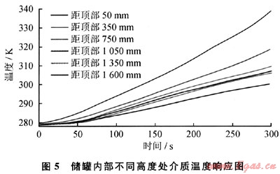 圖5所示為儲(chǔ)罐內(nèi)不同高度處介質(zhì)的溫度響應(yīng)規(guī)律。可以看出,池火作用下儲(chǔ)罐內(nèi)部存在熱分層現(xiàn)象,溫度總體呈現(xiàn)上高下低的趨勢(shì)。本文所模擬的LPG儲(chǔ)罐的初始充裝率為72%,對(duì)應(yīng)的氣液分界面位于距儲(chǔ)罐頂部540mm處??梢姡瑲庀鄿囟让黠@高于液相,且距離液面越遠(yuǎn)氣相溫度越高,說明氣相除了通過相變吸熱外,還通過氣相壁面吸收輻射熱量;另外,在距離儲(chǔ)罐頂部1350mm以下的液相區(qū),介質(zhì)溫度降低明顯,說明過冷液體區(qū)與液相分層區(qū)[2]的分界面可能位于此處附近。
