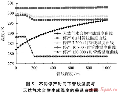 利用建立的溫度模型,結(jié)合關(guān)井后的初始條件,可以求出任意時(shí)刻管線內(nèi)的溫度分布。不同停產(chǎn)時(shí)間下管線溫度與天然氣水合物生成溫度的關(guān)系如圖5所示。