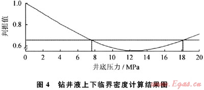 巖石力學方法求出的破裂壓力和坍塌壓力[1O~11]分別為pf=19.1MPa、pc=6.4MPa。利用本文中的斷裂力學方法計算求得的上下臨界壓力分別為pff=18.1MPa、pfc=7.6MPa,計算結(jié)果見圖4。綜合兩種方法,鉆井液的密度窗口為[7.6MPa、18.1MPa]。