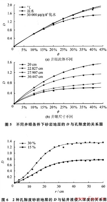 由圖5可以看出:低孔隙度地層井眼流體不同引起的相對(duì)比值差異較小,高孔隙度地層差異較大,且井眼內(nèi)充滿氣時(shí)相對(duì)變化量(D)越小,對(duì)確定含氣飽和度越不利;井眼內(nèi)流體為水時(shí),礦化度的高低對(duì)D的影響很小。在孔隙度一定的地層,井眼尺寸越大時(shí)D越小,這是主要是因?yàn)榫哿黧w為氣,井眼直徑越大挖掘效應(yīng)影響越大,故井眼尺寸越大越不利于含氣飽和度的評(píng)價(jià)。