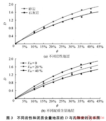 由圖3可以看出:砂巖地層和石灰?guī)r地層的相對(duì)比值(D)隨孔隙度的變化趨勢(shì)相同,在孔隙度較小時(shí)變化較大,當(dāng)孔隙度增加到一定程度時(shí)開始變緩;孔隙度較小時(shí)不同巖性引起D的差異較小,隨著孔隙度的增加地層巖性不同D的差異越大;孔隙度相同時(shí)下砂巖地層的D要比石灰?guī)r地層的大,原因是石灰?guī)r對(duì)中子的減速能力比砂巖大;泥質(zhì)含量引起的D的差異隨孔隙度的增加而增加,且孔隙度相同時(shí)泥質(zhì)含量越大D越小。因此利用熱中子計(jì)數(shù)率比相對(duì)變化量確定含氣飽和度時(shí)受巖性和泥質(zhì)含量的影響,砂巖地層對(duì)氣反應(yīng)靈敏,泥質(zhì)含量越大對(duì)確定地層含氣飽和度越不利。