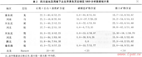 北美地區(qū)Barnett頁巖的石英、長石和黃鐵礦含量為20%~80%(其中石英含量為40%~60%),碳酸鹽礦物含量低于25%,黏土礦物含量通常小于50%。四川盆地下古生界2套頁巖的X射線熒光衍射(XRD)分析結(jié)果總體與Barnett頁巖相似(圖1、表2),其石英、長石和黃鐵礦的平均含量為30%~64%,碳酸鹽礦物的平均含量低于20%,極少數(shù)為0,黏土礦物含量平均在31%~51%。與Barnett頁巖對(duì)比,龍馬溪組的硅質(zhì)含量偏少,筇竹寺組的含量偏多,但龍馬溪組的碳酸鹽礦物含量較高,而筇竹寺組的含量偏少。研究表明,石英等脆性礦物含量高有利于后期的壓裂改造形成裂縫;碳酸鹽礦物中方解石含量高的層段,易于溶蝕產(chǎn)生溶孔。
