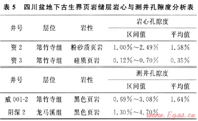 四川盆地頁巖儲(chǔ)層物性分析取得部分孔隙度資料,因滲透率測試靈敏度低未測出。資2井筇竹寺組黑色粉砂質(zhì)頁巖樣品物性分析孔隙度分布在1.0%~2.5%,平均孔隙度為1.58%;資3井硅質(zhì)頁巖的孔隙度為0.12%~0.70%。威001-2井筇竹寺組頁巖儲(chǔ)層的測井孔隙度在0.69%~3.08%,平均值為1.64%,滲透率在0.001~0.11mD,平均值為0.019mD[12~15]。陽深2井龍馬溪組測井解釋孔隙度一般為1.0%~5.0%(表5)。陽63、隆32等井在龍馬溪組已測試獲氣流,可見,四川盆地下古生界頁巖具備儲(chǔ)集條件。