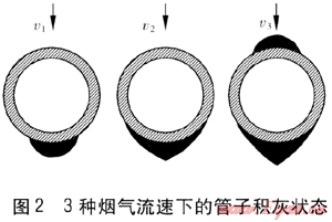 煙氣中攜帶的飛灰及催化劑粒徑一般都小于200μm,大部分是10~20μm的顆粒。當(dāng)含灰的氣流沖刷管束時(shí),產(chǎn)生旋渦區(qū),大顆粒由于慣性大,不易進(jìn)入旋渦,進(jìn)入旋渦區(qū)的大部分為微小顆粒。在分子力吸附作用和靜電力的作用下,遇到低溫受熱面管壁便聚積下來。松灰呈干松狀,易吹除,但其熱阻很大,對傳熱有很大影響[3]。積灰主要在管子背風(fēng)面形成,當(dāng)煙氣流速較大時(shí),迎風(fēng)面基本沒有積灰,因此積灰程度與煙氣流速有關(guān)。3種煙氣流速下管子的積灰狀態(tài)見圖2。圖中,v1>v2>v3。對于最高的煙氣流速v1,管子積灰最少,v2積灰較多,v3積灰最嚴(yán)重。因此,煙氣流速越大,在管子的背風(fēng)面越不易積灰。