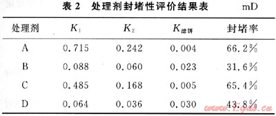 實(shí)驗(yàn)中采用代號(hào)為A、B、C、D的4種處理劑,在3.5MPa循環(huán)壓力下對(duì)取自井下同一深度的巖心進(jìn)行了封堵效果測(cè)試,結(jié)果見表2。