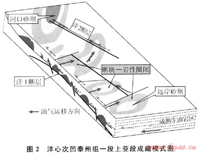 油氣成藏研究表明,白駒凹陷洋心次凹洋1、洋2、洋3等北西-南東向的斷層是在泰州組,阜寧組沉積完以后發(fā)育,三垛運(yùn)動(dòng)定型,其對泰一段上亞段的砂體沉積不起控制作用。但洋1斷層貫穿緩坡帶上的多個(gè)小砂壩,并與成熟生油區(qū)相連接,它將成熟生油區(qū)生成的石油,通過與其形成輸導(dǎo)網(wǎng)絡(luò)的次級斷層和砂體運(yùn)移到各個(gè)有利圈閉中,形成油藏,是開陽等油藏的主要油源的運(yùn)移通道?,F(xiàn)有的白駒油區(qū)已發(fā)現(xiàn)的油藏均屬此類。