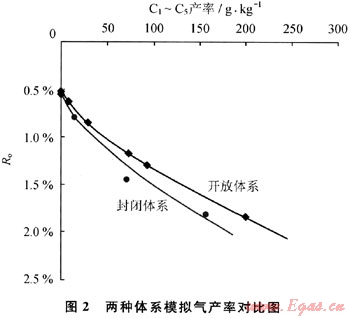 烴源巖在降解生油的同時(shí)生成烴類(lèi)氣體(圖2)。隨熱演化程度增高,開(kāi)放體系和封閉體系的烴氣產(chǎn)率大致按相近的趨勢(shì)增長(zhǎng),在達(dá)生油高峰之前(Ro<1.O%)二者差別不大,但其后差別逐漸明顯。在相同的成熟階段封閉體系比開(kāi)放體系氣產(chǎn)率略低,說(shuō)明壓力的存在對(duì)氣體的生成有一定抑制作用。前人大多認(rèn)為封閉體系與開(kāi)放體系相比,由于二次裂解生成的氣體較多,這應(yīng)與實(shí)驗(yàn)中實(shí)現(xiàn)的條件有關(guān)。本次封閉體系的實(shí)驗(yàn)中,烴源巖樣品位于反應(yīng)區(qū),其生成的油氣從樣品排出后由于存在流體壓力的調(diào)整(恒定壓力)及上浮現(xiàn)象會(huì)繼續(xù)運(yùn)移遠(yuǎn)離反應(yīng)區(qū),在高壓釜溫度相對(duì)較低的上下端部?jī)?chǔ)集起來(lái)。因此這是一個(gè)與地下條件較為接近的生排烴動(dòng)平衡過(guò)程。