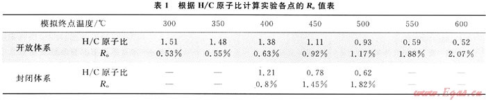 通過(guò)模擬實(shí)驗(yàn),可以獲取天然氣、水樣、含油石英砂(封閉體系)及源巖固體殘?jiān)?。天然氣直接進(jìn)行組分測(cè)試。水樣用二氯甲烷萃取,高壓釜及管線(xiàn)用二氯甲烷清洗,含油石英砂用氯仿抽提,均得到排出重質(zhì)油。源巖固體殘?jiān)寐确鲁樘?,抽提后殘余再進(jìn)行熱解、有機(jī)碳、干酪根處理、Ro及C、H、O元素測(cè)試。為使各種條件下的演化互相對(duì)應(yīng),采用H/C作為成熟度指標(biāo)與Ro聯(lián)系起來(lái)。例如Baskin引用Van Krevelen圖解表明干酪根不同Ro演化區(qū)間H/C原子比的變化[9],利用該圖解通過(guò)內(nèi)差計(jì)算各溫度點(diǎn)的Ro(表1)。