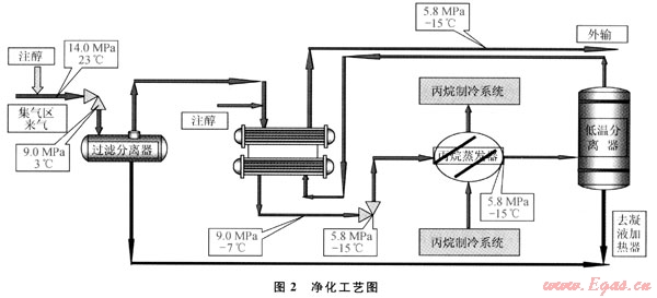 當(dāng)濕天然氣壓力較高或溫度較低時(shí),都易形成天然氣水合物,必須加入天然氣水合物抑制劑。在開工初期,雖然井口溫度較高,但管線溫度場未建立,也有生成天然氣水合物的可能。采用注入甲醇不回收工藝,采用移動(dòng)注醇車以節(jié)省投資;在凈化工藝的低溫分離段,采用注入乙二醇并回收的工藝,與注甲醇工藝相比,具有占地面積小、投資低、環(huán)境污染小、能耗小、運(yùn)行費(fèi)用低等優(yōu)點(diǎn)。
