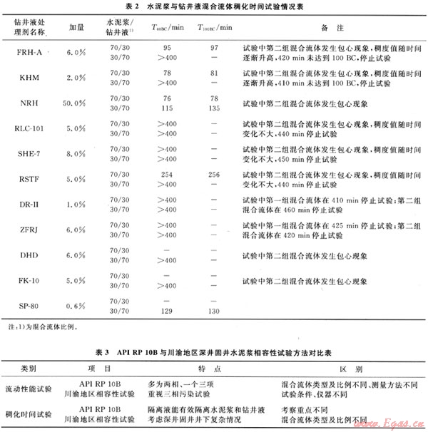 表1的試驗(yàn)結(jié)果表明,在該試驗(yàn)條件下水泥漿與上述兩類鉆井液會(huì)發(fā)生污染,混合流體較純水泥漿稠化時(shí)間最高縮短35%,在施工中應(yīng)引起重視。水泥漿與鉆井液接觸污染問題是一個(gè)互相污染的過程,判斷污染源可從2個(gè)方面出發(fā):①根據(jù)混合流體的流變性能判別,如果混合流體流動(dòng)度低則判別為鉆井液抗鈣性差,是由于鉆井液中的黏土顆粒聚結(jié)造成的,即是水泥漿污染了鉆井液的表現(xiàn)。如果混合流體的流變性能保持良好則說明鉆井液的抗鈣能力較強(qiáng),水泥漿對(duì)鉆井液基本沒有不良影響;②根據(jù)混合流體的稠化時(shí)間來判別,如果混合流體稠化時(shí)間較水泥漿稠化時(shí)間縮短,說明是水泥漿受到鉆井液污染后帶來緩凝劑失效造成的。