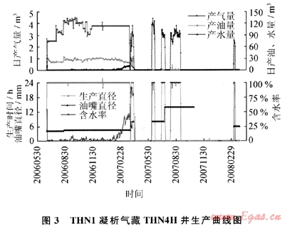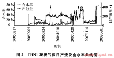 THN1凝析氣藏的生產(chǎn)動態(tài)資料顯示,2007年7月開始排液采氣時,排液井僅2口——THN2、THN4H井,且排液僅15d(7月12~27日)后即關井,至8月12日又才開井排液。排液井數(shù)少、排液時間短,在短時間內(nèi)不能完全阻止已推進氣藏內(nèi)部的邊水繼續(xù)向前推進,導致內(nèi)部氣井,甚至一線井都不見效。