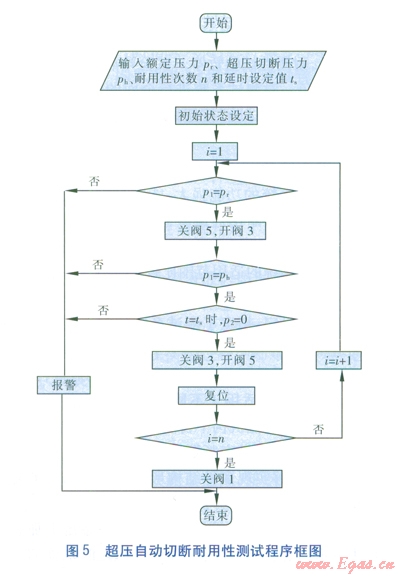 超壓自動切斷耐用性自動測試程序框圖見圖5,其中P1為圖4中壓力變送器7反饋至PLC的壓力值,P2為圖4中壓力變送器9反饋至PLC的壓力值。