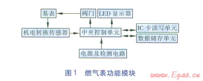 我公司研發(fā)的燃?xì)獗砉δ苣K組成見圖1。中央控制單元是該燃?xì)獗淼暮诵?。通過Ic卡讀寫單元,使用異常流量參數(shù)IC設(shè)置卡或無線形式將燃?xì)猱惓A髁繀?shù)傳入燃?xì)獗淼闹醒肟刂茊卧?,通過中央控制單元保存到數(shù)據(jù)儲存單元中,作為異常流量的判斷依據(jù)。當(dāng)前的瞬時(shí)流量數(shù)據(jù)從基表通過機(jī)電轉(zhuǎn)換傳感器讀入到中央控制單元后,由中央控制單元計(jì)算出當(dāng)前表內(nèi)的瞬時(shí)流量值并與數(shù)據(jù)儲存單元中的異常流量參數(shù)范圍進(jìn)行比較。當(dāng)確認(rèn)流量異常時(shí),中央控制單元發(fā)出關(guān)閥操作信號給閥門,閥門關(guān)閉,同時(shí)向顯示器輸出異常流量信號,顯示器顯示異常提示[1]。