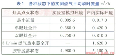 基表型號為Gl.6,氣源為天然氣,壓力為3000Pa,燃具在各種狀態(tài)下測定的瞬時(shí)流量經(jīng)整理后的平均值見表1。