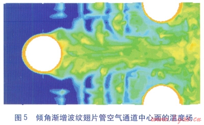 空氣進(jìn)口速度為4m/s時,兩種波紋翅片管空氣通道中心面的溫度場分別見圖4、5。由圖4、5可知,兩種波紋翅片管的溫度分布都很紊亂且成狹長帶狀。在迎風(fēng)側(cè),傾角漸增波紋翅片管空氣通道中心面空氣溫度上升得較快,且出口溫度高于均勻傾角波紋翅片管。這是由于傾角漸增波紋翅片結(jié)構(gòu)加強了氣流擾動,從而強化了換熱。兩種波紋翅片管的共同點是:在迎風(fēng)側(cè),溫度場分布稠密,溫度上升較快,換熱較強烈;在背風(fēng)側(cè),溫度場分布稀疏,溫度變化較小,換熱較平緩。