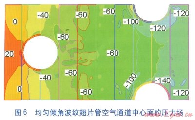空氣進(jìn)口速度為4m/s時,兩種波紋翅片管空氣通道中心面的壓力(表壓)場分別見圖6、7,圖中數(shù)值單位為Pa。由圖6、7可知,兩種波紋翅片管的壓力分布均比較紊亂。傾角漸增波紋翅片管空氣通道中心面的壓力降要大于均勻傾角波紋翅片管,且隨著翅片傾角的增大,等壓線分布更加稠密。原因是傾角漸增波紋翅片結(jié)構(gòu)對流體的阻滯和擾動作用都較大,阻力比均勻傾角波紋翅片管大。