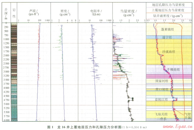 龍16井陸相地層的聲波、密度和電阻率3條曲線從中侏羅統(tǒng)沙溪廟組下部開始出現(xiàn)明顯偏離泥巖正常壓實趨勢[5](圖1)。因此判斷地層孔隙壓力白沙溪廟下部逐漸升高,部分井上三疊統(tǒng)須家河組的地層壓力系數(shù)高達l.83,本區(qū)實測壓力數(shù)據(jù)、鉆井液氣侵等現(xiàn)象也說明了須家河組具有較高的壓力異常。海相地層孔隙壓力形成機理和預(yù)測方法比較復(fù)雜,通過各井鉆井液密度、漏失和氣浸溢流等現(xiàn)象分析,認(rèn)為部分井段碳酸鹽地層壓力系數(shù)最高至2.15(如下三疊統(tǒng)嘉陵江組嘉二段高壓鹽水層)。