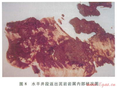 該體系2011年開始在水平井規(guī)模推廣,現場應用累計超過80井次,平均縮短水平井段施工周期5~8d,應用效果表明,無土相暫堵鉆(完)井液體系潤滑防卡性能好、低剪切速率下攜屑能力強,返出H泥巖巖屑內部呈干態(tài),表明抑制性良好,未出現吸水膨脹現象(圖8)。