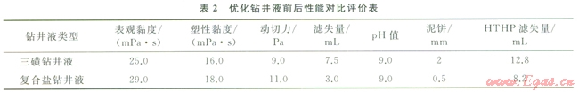 通過對“石千峰組、石盒子組”地層坍塌機理研究,從強化封堵、抑制膨脹和力學平衡三方面進行攻關,研制出CQSP-X強抑制無土相復合鹽鉆井液體系。體系配方為:1.5%SFT-1+1%SMP-2+0.3%CMC(PAC)+0.5%HL60+0.2%NaOH+0.5%CMS+4%~5%QS~4+10%~l5%KCI+10%WT-l。其豐要性能與三磺鉆井液體系對比如表2所示??梢钥闯?,體系防塌能力強、潤滑防卡性能好、低剪切速率下攜屑能力強。