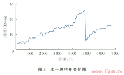 在長水平段水平井鉆井過程中,由于鉆具與井壁底部形成的巖屑床相互作用,鉆井液固相含量高導(dǎo)致潤滑效果下降等[4]原因,鉆具與井壁之間的摩擦阻力隨著水平段長度的增加而不斷增大,影響水平段鉆進(jìn)長度。根據(jù)常規(guī)水平井實(shí)鉆分析,裸眼內(nèi)摩擦系數(shù)比套管內(nèi)摩擦系數(shù)大。Æ215.9mm井眼的水平段鉆至4851m,鉆水平段長度1200m,下Æ177.8mm套管固井。根據(jù)現(xiàn)場施工獲得的扭矩、摩阻數(shù)據(jù)分析(圖2、3),通過優(yōu)化井身結(jié)構(gòu),有效降低了長水平段施工過程中的摩阻系數(shù),提高了施工效率。