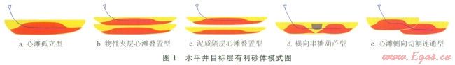 通過儲層精細(xì)描述,水平井部署區(qū)域地質(zhì)情況基本清楚,最終確定水平井目標(biāo)層。從蘇里格氣田沉積地質(zhì)特征來看,目前水平井部署主要有5種有利砂體模式:①心灘孤立型(圖1-a);②物性夾層心灘疊置型(圖1-b);③泥質(zhì)隔層心灘疊置型(圖1-c);④橫向串糖葫蘆型(圖1 d);⑤心灘側(cè)向切割連通型(圖]-e)。根據(jù)部署區(qū)域砂體或疊置砂體類型情況,優(yōu)選出一種砂體模式或砂體模式組合作為水平井目標(biāo)層。
