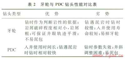 在保證施工質(zhì)量和安全的前提下,為了加快鉆井速度,優(yōu)化了鉆頭選型。主要采用以下兩種優(yōu)化模式:①斜井段采用“1+1”模式;②水平段采用“N+1”模式。“1+1”模式指一個牙輪鉆頭加一個PDC鉆頭,“N+1”模式指多個PDC鉆頭加一個牙輪鉆頭。牙輪鉆頭作為備用,當(dāng)發(fā)生巖性相變等特殊情況時,用于快速調(diào)整井斜川(表2)。