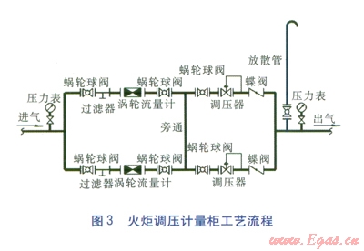 調(diào)壓計量柜內(nèi)安裝兩路調(diào)壓計量裝置,在兩路并聯(lián)的前提下增加旁通管將兩路裝置連接。火炬調(diào)壓計量柜工藝流程見圖3。燃氣計量設施安裝于調(diào)壓器之前,一路采用工況(298.15K,0.26MPa)流量為l000m3/h的渦輪流量計;另一路計量采用工況(298.15K,0.26MPa)流量為650m3/h渦輪流量計:調(diào)壓器最大流量>4500m3/h。