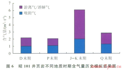 筆者以昭101井、l03等井為例開展了歷史模擬和流體包裹體分析,證實了斷裂對氣藏起強烈破壞這一判斷。昭通除靠近四川盆地的小部分區(qū)域外,多數(shù)鉆井都不成功,含氣量低(0.05~0.50m3/t)。昭通與蜀南相鄰,應該大致經歷了相似的演化歷程(圖5),含氣性差別大。昭101井位于芒部背斜,地表斷裂發(fā)育。目的層筇竹寺組因斷裂出現(xiàn)地層重復,頁巖裂隙發(fā)育、方解石充填嚴重,含氣量的現(xiàn)場分析結果不足0.1m3/t,評價為極低含氣量,基本全部逸散。開展的昭101井熱演化歷史和含氣量歷史模擬研究表明:昭通地區(qū)J-K末期含氣量最大,如果穩(wěn)定抬升頁巖將出現(xiàn)超壓,含氣量應該至少介于3~5m3/t,但是目前小于0.1m3/t(圖6)。