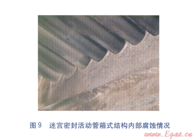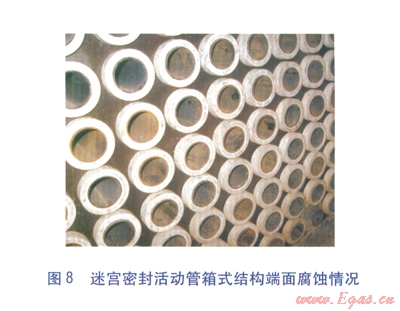 經(jīng)研究,認(rèn)為采用非金屬材料的迷宮密封結(jié)構(gòu)可以有效消除縫隙腐蝕的發(fā)生,迷宮密封活動(dòng)管箱式結(jié)構(gòu)見圖7。鍍搪瓷鋼管穿入迷宮密封套中(內(nèi)環(huán)面加工有迷宮鋸齒槽),迷宮鋸齒槽與鋼管外表面形成若干道迷宮腔,從而實(shí)現(xiàn)了密封。迷宮密封活動(dòng)管箱式結(jié)構(gòu)不但具有端面填料函密封的活動(dòng)管箱式結(jié)構(gòu)的優(yōu)點(diǎn),還由于換熱管與箱體板之間有柔性迷宮密封套隔離,避免了在安裝、運(yùn)行過程中對(duì)搪瓷層的破壞,從本質(zhì)上消除了縫隙腐蝕的發(fā)生[5]。經(jīng)技術(shù)改造后的空氣預(yù)熱器,連續(xù)運(yùn)行2年后運(yùn)行狀況依然良好,箱體板及換熱管各部位基本上沒有發(fā)生腐蝕(見圖8、9)。