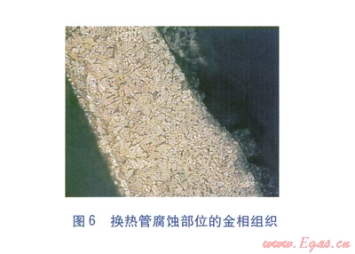 鍍搪瓷鋼管穿入箱體板中,壓板擠壓柔性石墨密封圈,以填充箱體板與換熱管間的填料函起到密封作用。與整體焊接的固定管箱式結(jié)構(gòu)相比,這種結(jié)構(gòu)一是可以削弱換熱管根部承受的交變應(yīng)力,二是可有效避免焊接導(dǎo)致的管道抗腐蝕性能的降低。經(jīng)過技術(shù)改造,使用壽命提高到l0~12個(gè)月。雖然技術(shù)改造后空氣預(yù)熱器的使用壽命有了一定延長,但效果仍不理想。通過現(xiàn)場(chǎng)勘察,技術(shù)改造基本杜絕了換熱管主體的酸露點(diǎn)腐蝕,腐蝕主要發(fā)生在換熱管與箱體板、柔性石墨密封圈接觸的部位(見圖5)。通過對(duì)換熱管腐蝕部位的金相組織(見圖6)分析發(fā)現(xiàn),腐蝕成因?yàn)榈湫偷目p隙腐蝕[3-4]。