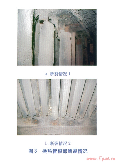 根據(jù)以上分析,課題小組選用抗腐蝕性能較高的ND鋼(09CrCuSb)對(duì)換熱管進(jìn)行改造,仍采用整體焊接的固定管箱式結(jié)構(gòu)。但改造后,5~10個(gè)月?lián)Q熱管根部再次出現(xiàn)了斷裂。不但使用壽命沒有有效延長,而且由于ND鋼的價(jià)格較高,導(dǎo)致成本急劇增加。