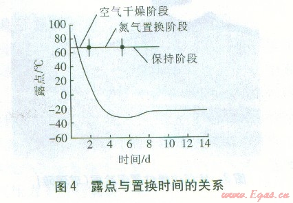 根據(jù)充氮速度,每隔一段時間觀察并記錄壓力表讀數(shù)以及采樣口的氧氣含量和露點(diǎn),當(dāng)氧氣含量和露點(diǎn)達(dá)到要求時,置換工作結(jié)束。此時,需要用氮?dú)馐箖蘧S持一定的壓力,以防濕空氣再次進(jìn)入。