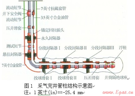 完井管柱綜合考慮了腐蝕防護(hù)、儲層改造、采氣生產(chǎn)、完井工藝、井控安全等內(nèi)容(圖1),主要南井下安全閥、永久封隔器、懸掛封隔器、投球滑套、分段封隔器、壓差滑套等工具組成【4】。永久封隔器抗壓差能力為70 MPa,分段封隔器抗壓差能力為49.5 MPa,它們與多級滑套、隔斷球坐配套使用,通過液壓坐封實現(xiàn)氣層分段和封閉裸眼段功能。