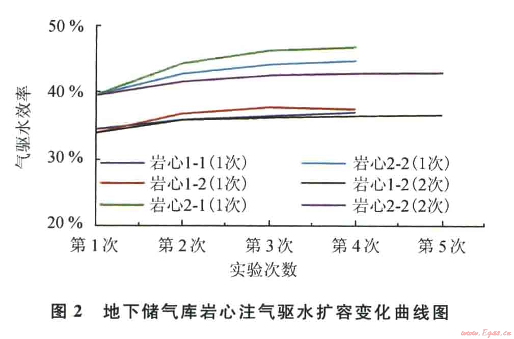 實(shí)驗(yàn)結(jié)果揭示:地下儲氣庫內(nèi)的含水區(qū)可以實(shí)現(xiàn)較高的氣體驅(qū)替,4塊巖心的氣驅(qū)試驗(yàn)壓力降落區(qū)間為地下儲氣庫原始壓力的100%~29%時,第l次氣體驅(qū)替效率可達(dá)到34%~40%,第2、3次累加氣驅(qū)效率可達(dá)36%~46%;地下儲氣庫實(shí)際注采生產(chǎn)過程中隨多周期的注采驅(qū)替,氣驅(qū)水達(dá)容效率是逐步增加的過程,或者說若要實(shí)現(xiàn)地下儲氣庫較高的氣體驅(qū)替效率,則需要多年的注采周期。