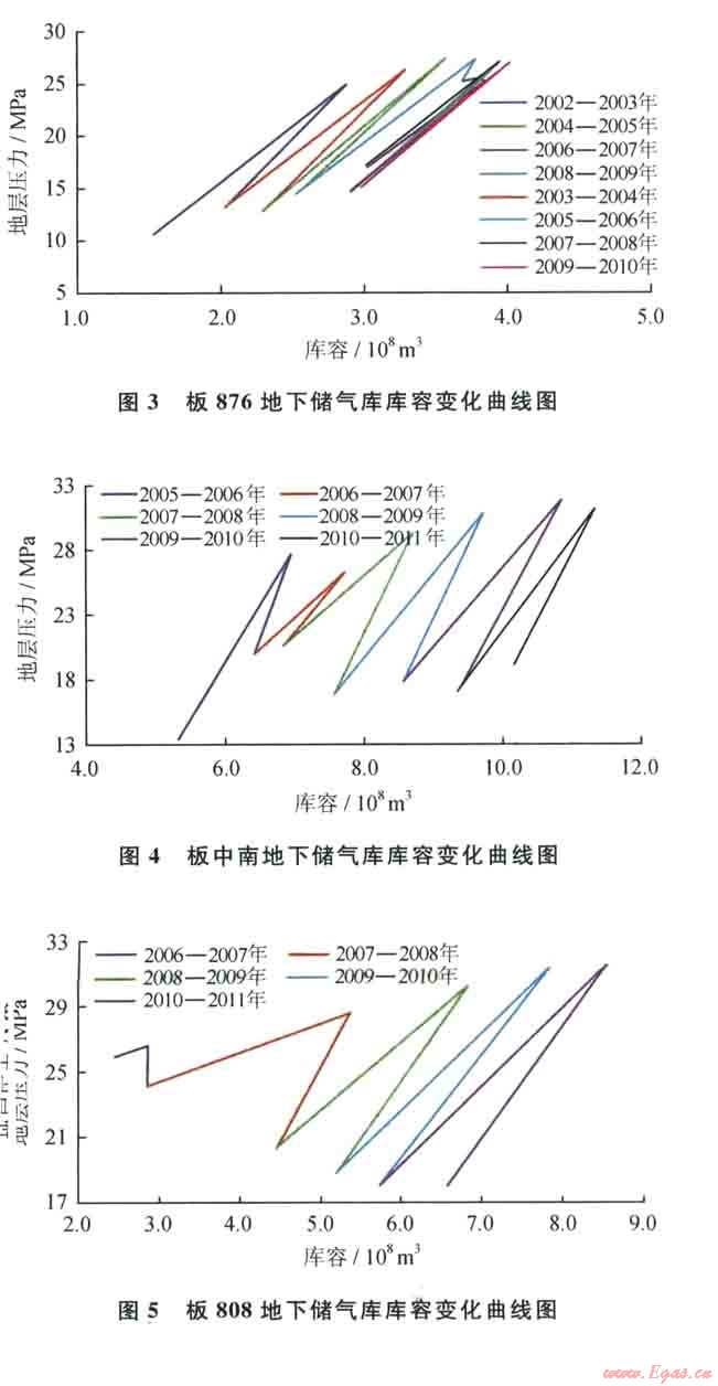 1)地下儲氣庫庫容量呈現(xiàn)逐漸增加的趨勢,并最終趨于最大庫容量。以注氣期結(jié)束時的庫容量為地下儲氣庫的當(dāng)期庫容量,采氣期結(jié)束時的庫容量為地下儲氣庫的當(dāng)期墊氣量,庫容量與墊氣量之差即為當(dāng)期工作氣量(采氣量)。從地下儲氣庫的實(shí)際庫容量變化曲線看(圖3~7),隨著地下儲氣庫注采周期的增加,庫容曲線普遍右移,地下儲氣庫庫容明顯增大,而且注采周期越多,庫容增加愈多。板876地下儲氣庫運(yùn)行5~8個注采周期時,庫容變化曲線基本重疊,表明地下儲氣庫已達(dá)到最大庫容量。由此也說明地下儲氣庫達(dá)容是一個長期的過程。從已建地下儲氣庫的達(dá)容特征看,水淹型地下儲氣庫的達(dá)容周期超過5年。