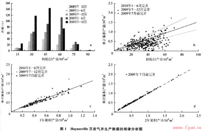 自2007年發(fā)現(xiàn)到2011年10月為止,已鉆頁巖氣井約1500口,日產(chǎn)氣約1.56×108m3,累積產(chǎn)氣量已超過710×108m3。與開發(fā)歷史30年(1981—2011年)、累積產(chǎn)能2550×108m3的Barnett頁巖(14900口井)相比,Haynesville頁巖氣藏?zé)o疑是開發(fā)潛力極大的非常規(guī)能源。