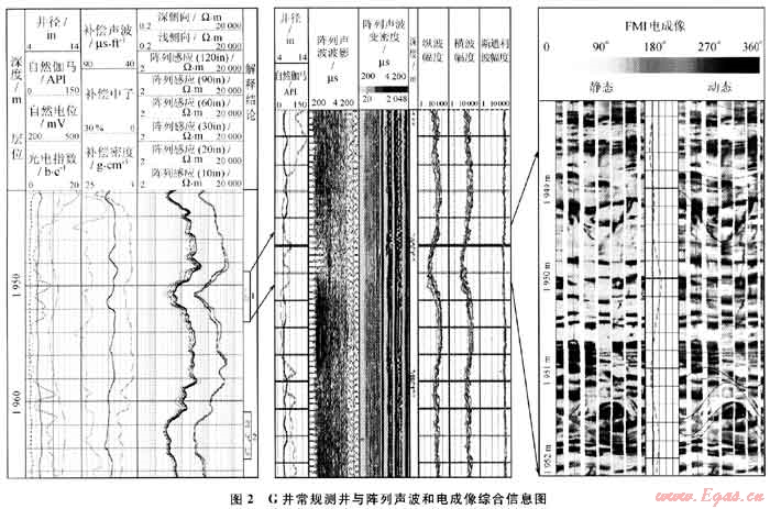 低孔裂縫型儲層:利用常規(guī)測井資料難以識別,需根據(jù)成像測井圖上的裂縫響應(yīng),陣列聲波變密度干擾圖形、波形幅度降低及陣列聲波縱波、橫波和斯通利波能量衰減,斯通利波計算的滲透率大等特征識別。如川東地區(qū)G井須家河組1948.8~1953.2m井段,用常規(guī)測井資料識別難度較大,但陣列聲波變密度干擾明顯、波形幅度降低及陣列聲波縱波、橫波和斯通利波能量有明顯衰減,電成像圖上有明顯裂縫顯示,可清楚說明該段裂縫較發(fā)育,為低孔一裂縫型儲層,中途測試產(chǎn)天然氣1.42×104m3/d。其測井特征詳見圖2。