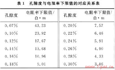 根據(jù)工區(qū)地層水電阻率、含氣飽和度、膠結(jié)指數(shù)、飽和度指數(shù)等參數(shù),建立孔隙度與氣層電阻率下限值關(guān)系,并計算氣層電阻率下限值關(guān)系曲線[4~5],比較該曲線與深側(cè)向電阻率值大小來判別儲層。即:電阻率值大于氣層下限值,為氣層;否則為氣水同產(chǎn)或產(chǎn)水。表1為某區(qū)塊孔隙度與電阻率下限值,由此獲得了氣層下限電阻率計算公式為: