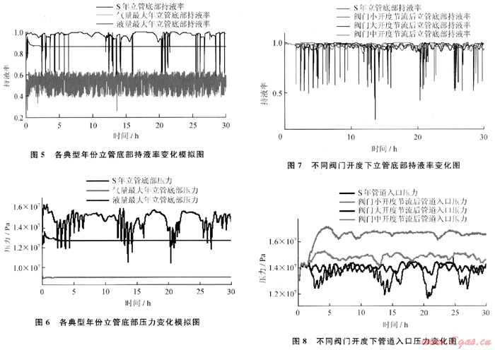 對3個典型年份(氣量最大年、液量最大年及油氣田開發(fā)后期的S年)進行了模擬,模擬時間為30h。各年份的氣油比為90。隨著油氣田開發(fā)的進行,油氣含水量逐年增大,S年油氣含水率達75%,油氣產(chǎn)量為氣量最大年的1/8,為液量最大年的1/4。