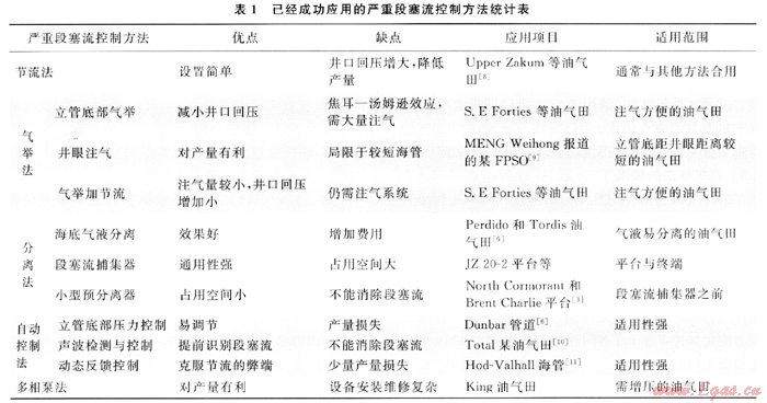 筆者將各種已成功應(yīng)用于油氣田生產(chǎn)的嚴(yán)重段塞流控制方法進行了總結(jié),結(jié)果如表1所示。每種控制方法都有一定的適用范圍,隨著流體物性、海底路由、油氣田產(chǎn)量以及下游設(shè)施的不同而不同。應(yīng)針對不同的工程項目,開展具體模擬分析,必要時可以結(jié)合多種方法來控制嚴(yán)重段塞流。