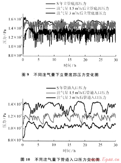 采用氣舉法來控制S年的段塞流。氣舉法所用氣體為該油氣田處理之后的外輸氣。氣舉法涉及注氣量和注氣位置的選擇,對此,進行如下分析。