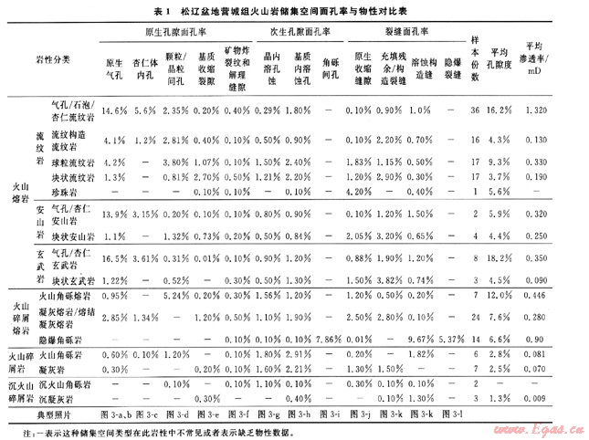 流紋構(gòu)造形成流紋理間孔(圖3-a),常見,且特點(diǎn)是氣孔成串珠狀分布,可能發(fā)生連通的孔隙,在噴溢相中、上部亞相發(fā)育(圖2),如果此后遭受風(fēng)化淋濾作用,極易形成風(fēng)化殼(圖3-m),且該類構(gòu)造的巖石在平面上延伸較長,所以可形成大面積的儲(chǔ)層。