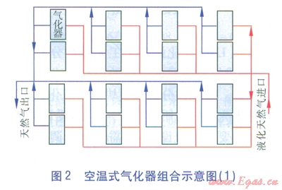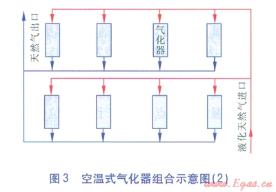 空溫式氣化器的臺數和氣化量,可跟據工程建設規(guī)模和用戶的要求綜合確定。空溫式氣化器組合示意見圖2、3。